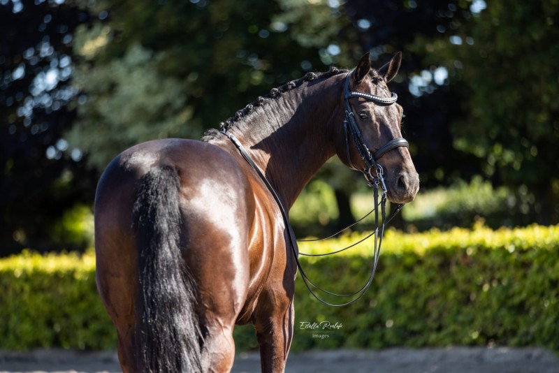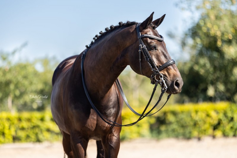 Beautiful dark bay gelding by De Niro x Westpoint, 10 years old, approximately 1.70m. Trained at Sub- PSG level / Advanced Medium / Fourth Level. with confirmed lateral work, flying changes, and good collection.
